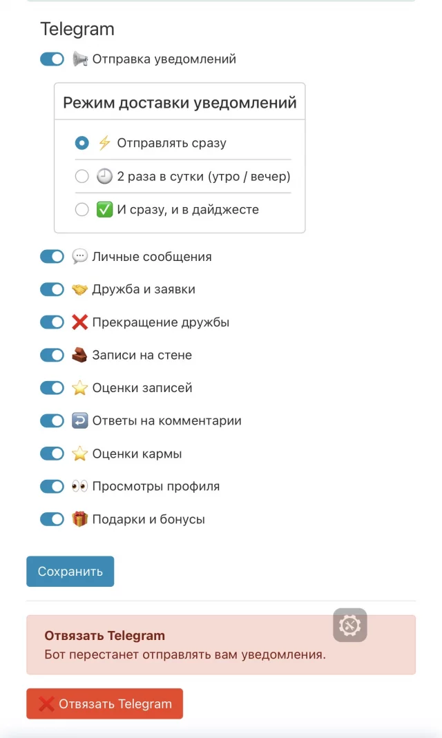 Нажмите кнопку подключить Telegram. После этого откроется бот и привяжет ваш аккаунт. Далее возвращайтесь на страницу настроек и выбирайте, какие уведомления вы хотите получать в Telegram